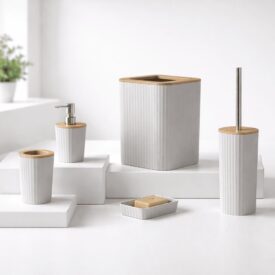 Set accessori bagno 5 pezzi Feridras SHOW in plastica e bamboo bianco con dispenser, portascopino e pattumiera 5 litri.