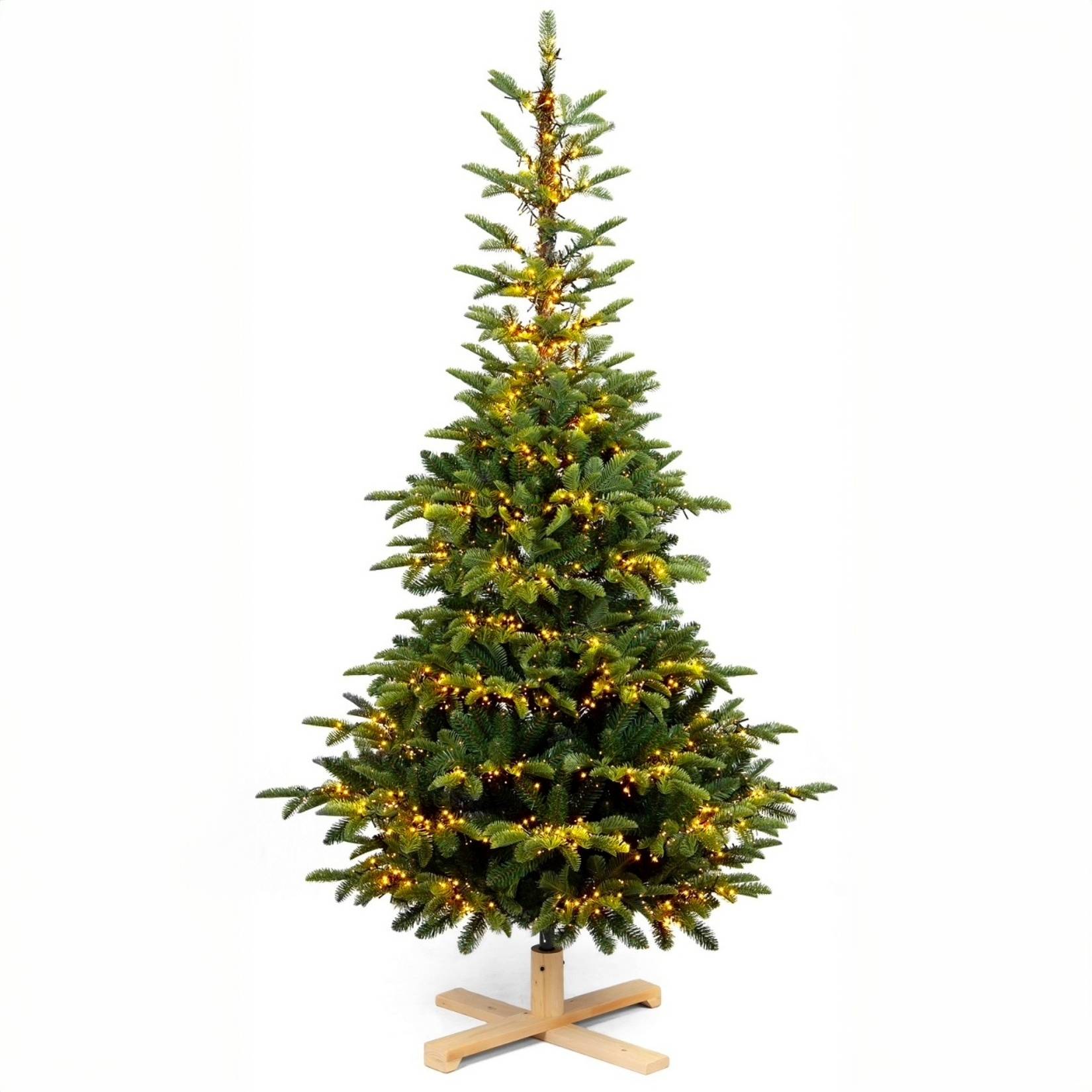 Albero di Natale 210 cm Modello Robin con Luci LED Calde, Base in Legno e Montaggio a Ombrello
