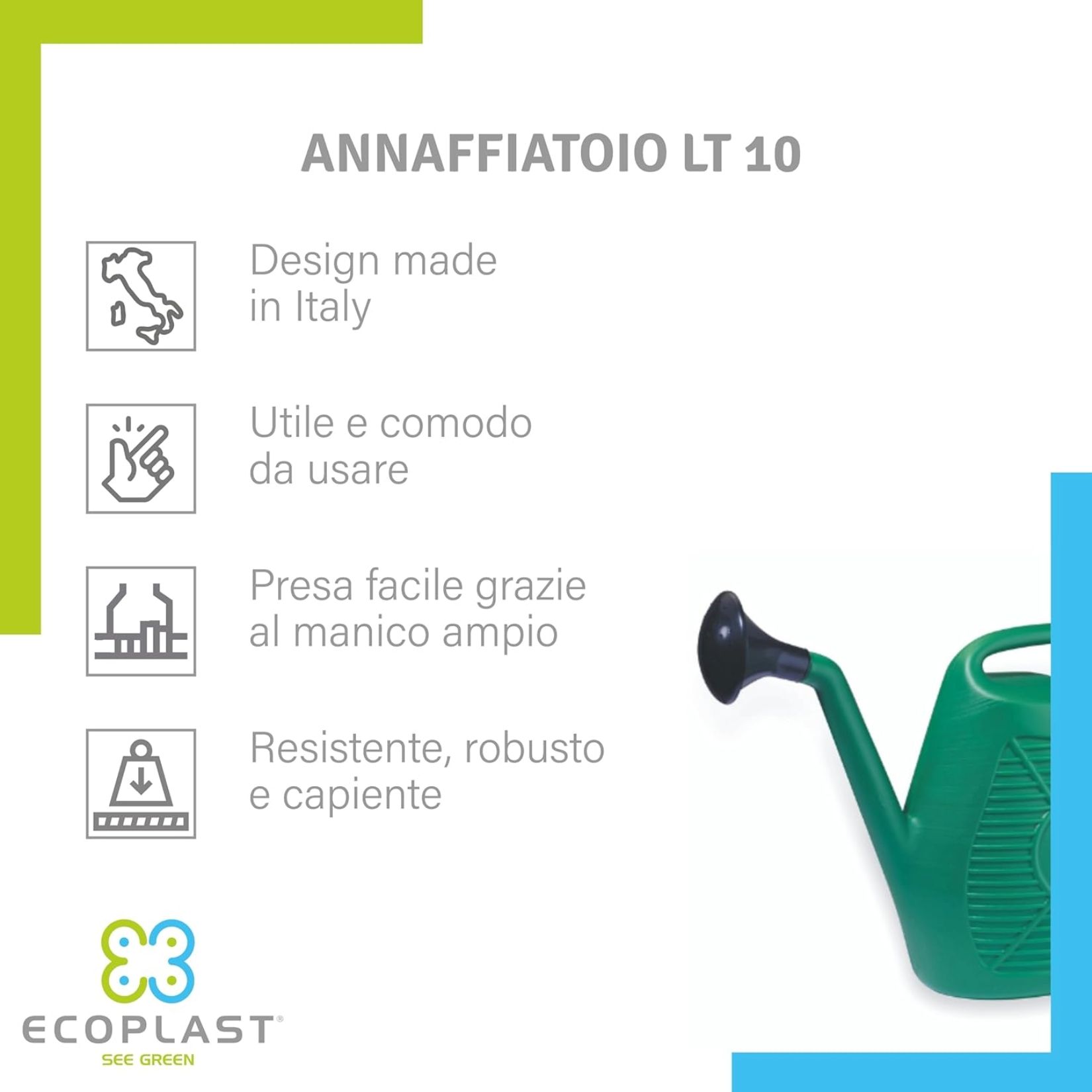 Annaffiatoio Ecoplast 10 Litri in Plastica Verde – Pratico e Resistente per Giardino, Orto e Balcone – 47,5x19x36 cm