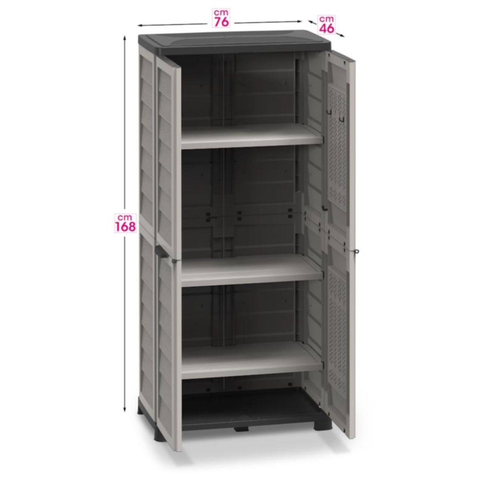 Le sue dimensioni generose (76x46x168 cm) permettono di sfruttare al meglio lo spazio verticale, garantendo una grande capacità di contenimento. All’interno, l’armadio è dotato di tre ripiani regolabili, ciascuno con una portata massima di 20 kg, che consentono di organizzare in modo efficiente prodotti per la pulizia, attrezzi da lavoro, articoli da giardinaggio, accessori per animali o piccoli elettrodomestici.