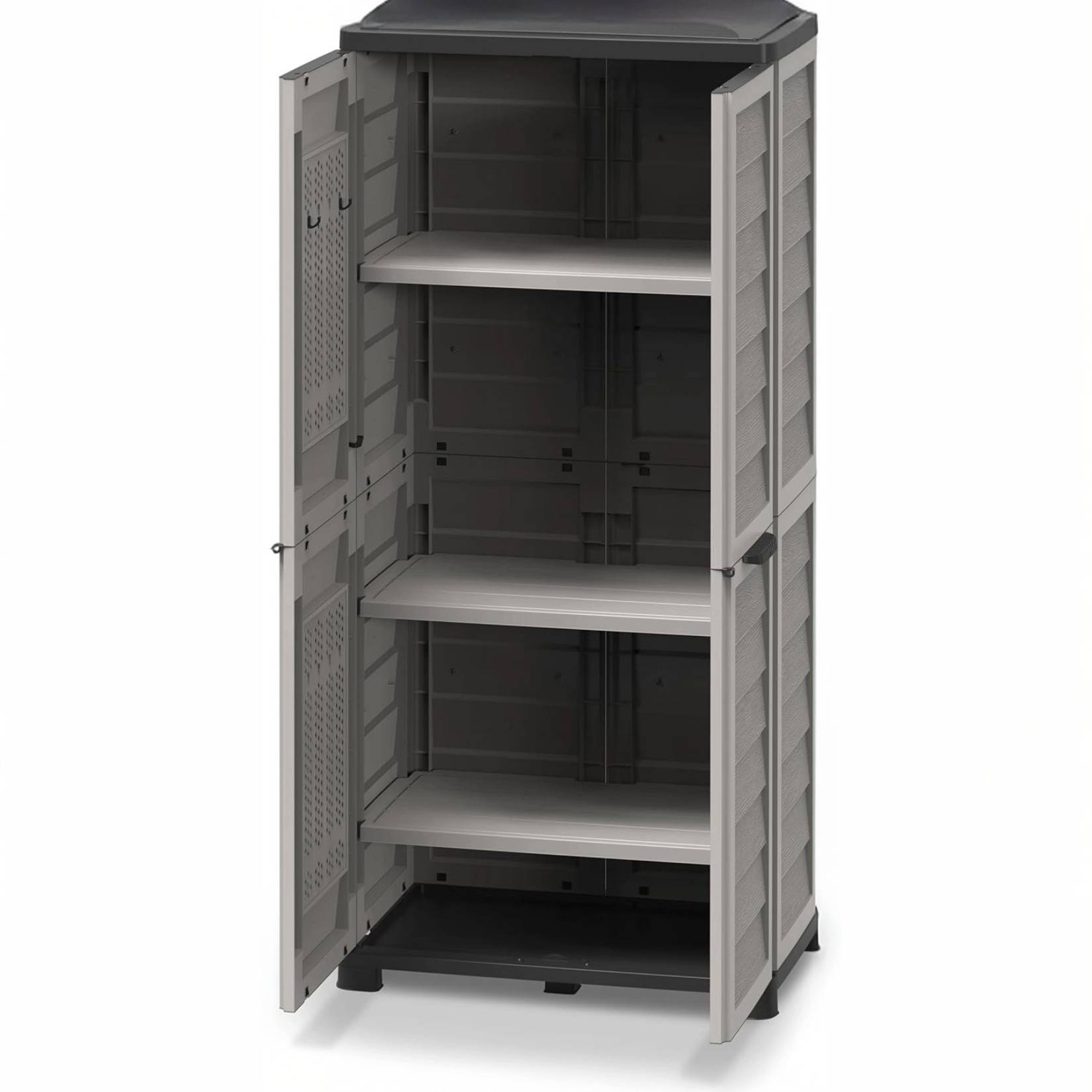 Le ante a doppia apertura sono dotate di maniglie ergonomiche che assicurano una presa confortevole e un’apertura fluida. Il sistema di chiusura è predisposto per l’utilizzo di un lucchetto, offrendo ulteriore sicurezza per gli oggetti riposti. La base stabile e i piedini antiscivolo assicurano una perfetta aderenza al pavimento, anche su superfici leggermente irregolari.