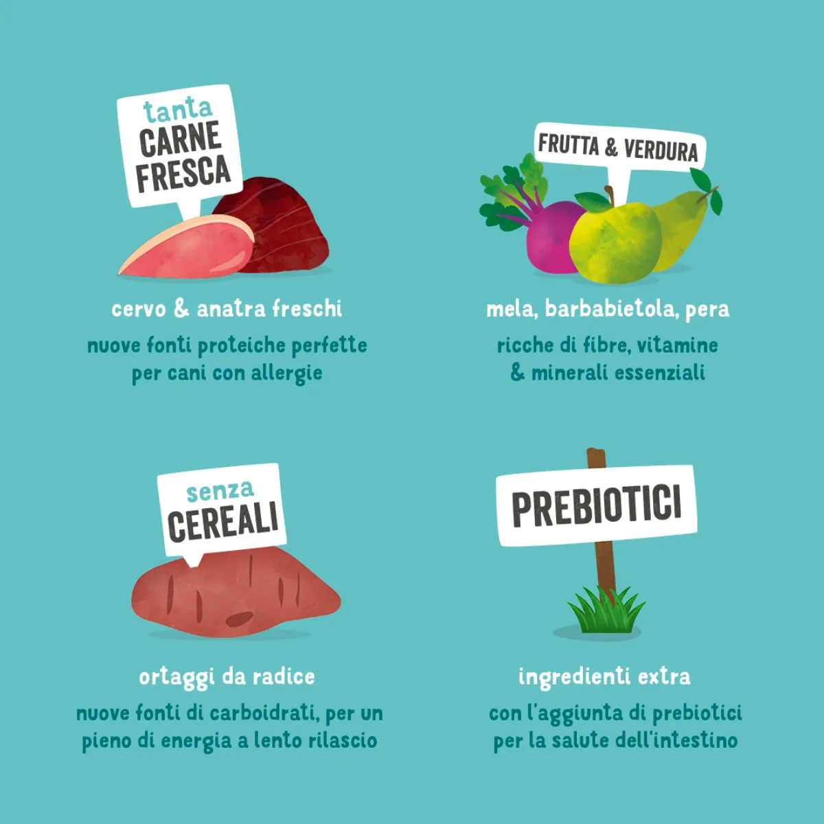 La ricetta è priva di cereali, rendendola ideale per cani con sensibilità alimentari o intolleranze. L’assenza di glutine riduce il rischio di reazioni allergiche, mentre la presenza di ingredienti facilmente digeribili favorisce una digestione sana e regolare.