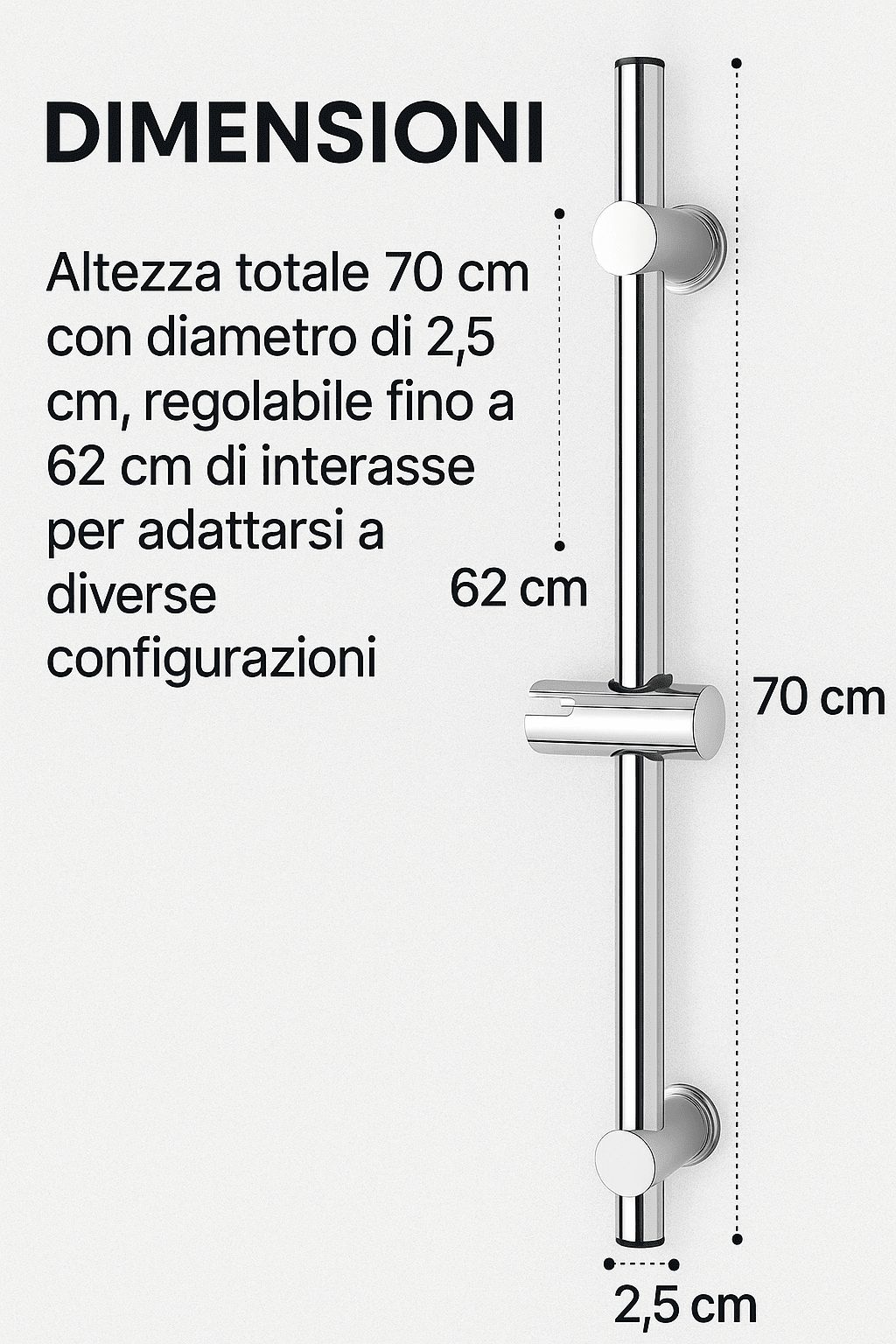 Il cuore del prodotto è la barra da 85 cm in finitura cromata, dimensione ideale per garantire un ampio margine di regolazione dell’altezza del soffione o della doccetta. Questa misura permette di soddisfare le esigenze di tutta la famiglia: adulti di diversa statura, ragazzi e persone che preferiscono una posizione più alta o più bassa del getto d’acqua trovano facilmente l’assetto più confortevole. L’escursione verticale consente di ottimizzare la fruibilità della doccia, migliorando l’esperienza quotidiana senza interventi strutturali invasivi.