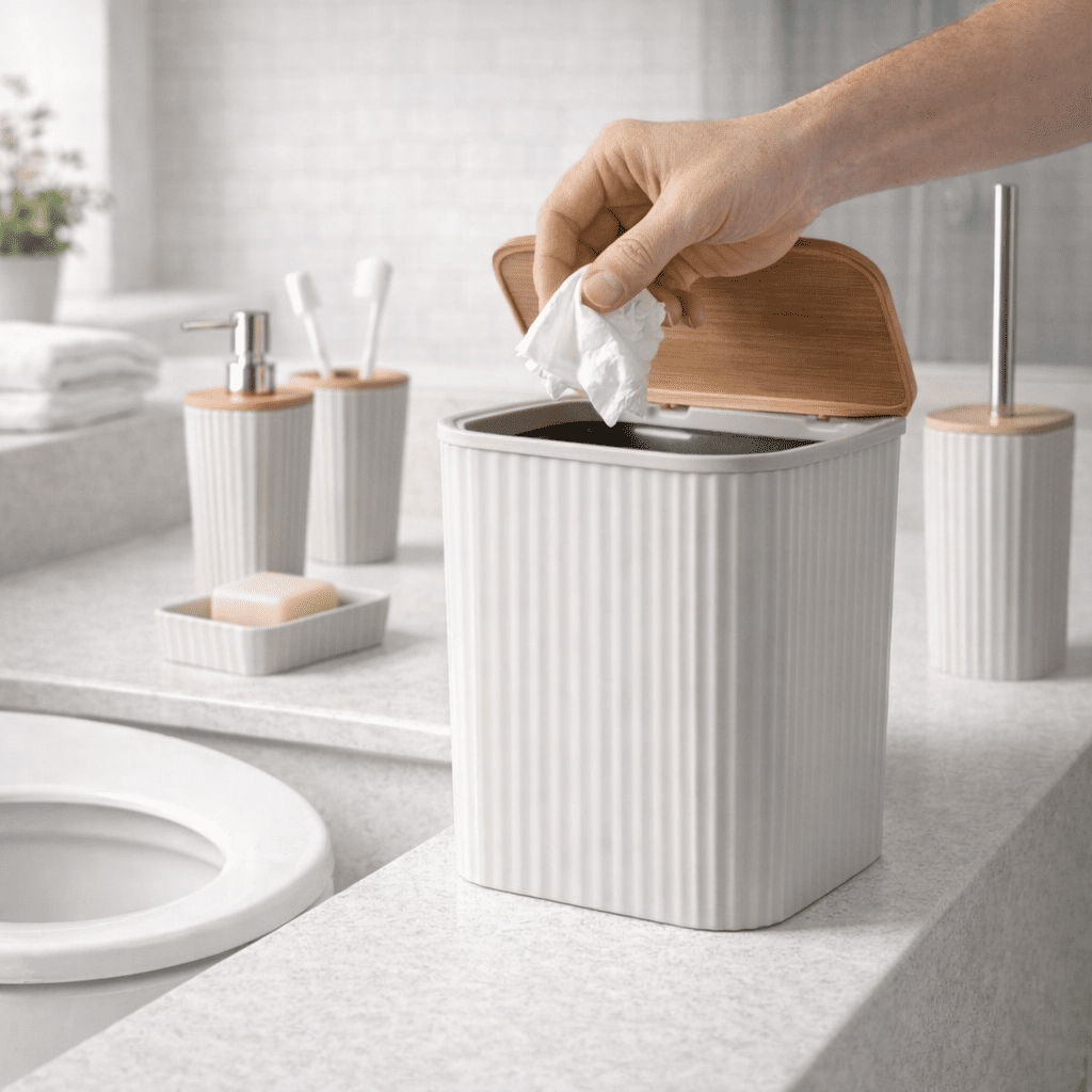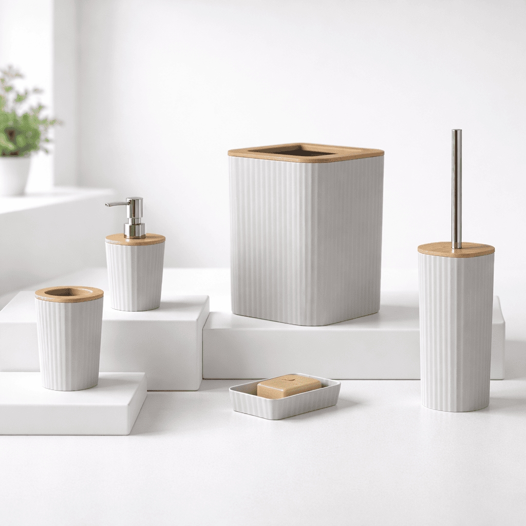 Feridas – Set Accessori Bagno 5 Pezzi Show in Plastica e Bamboo Crema – Dispenser, Portascopino e Pattumiera 5L