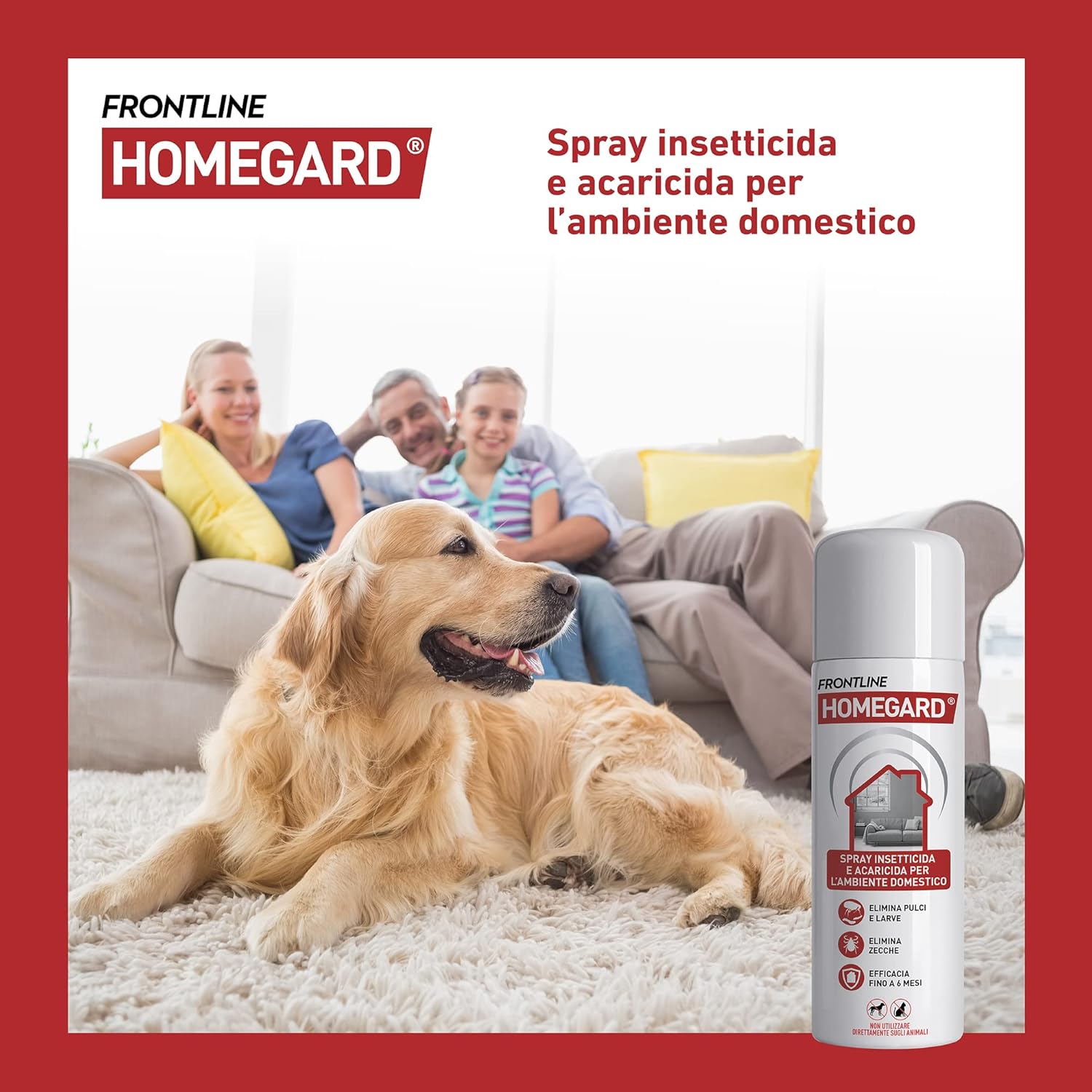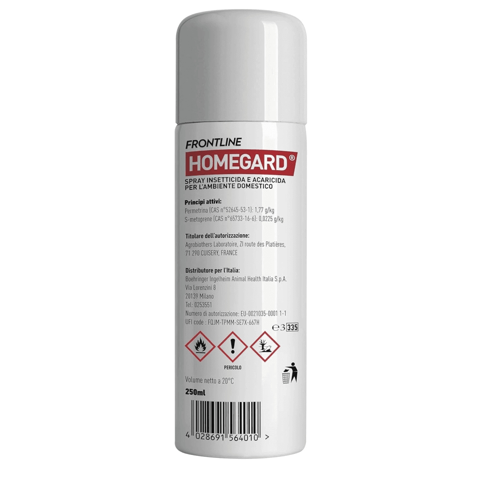 Frontline Homegard Spray è un prodotto per uso esclusivamente ambientale: non va applicato direttamente su cani, gatti o altri animali. La sua funzione è trattare gli spazi della casa, riducendo la presenza di parassiti e contribuendo a contenere il rischio di nuove infestazioni in combinazione con adeguati trattamenti antiparassitari sull’animale.