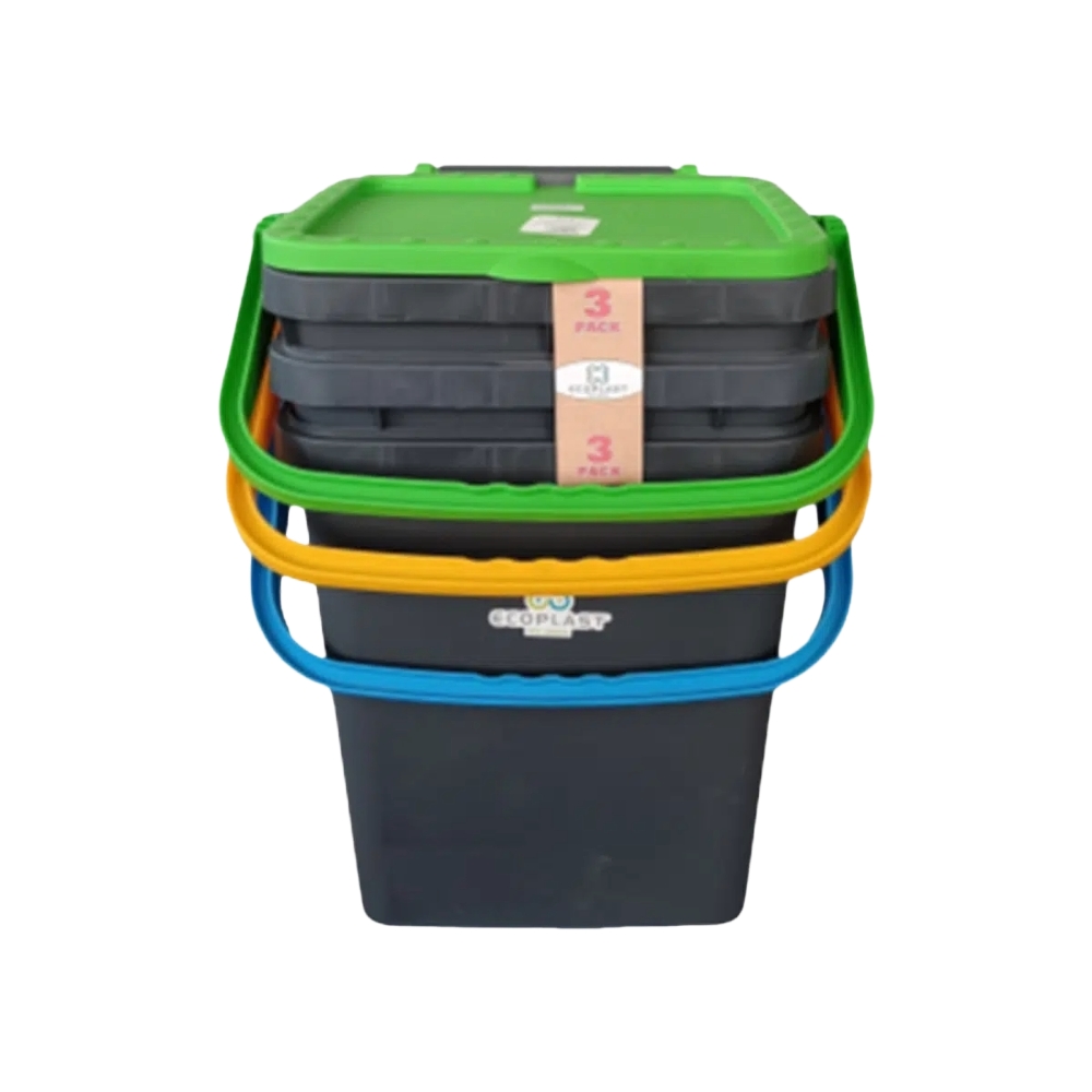 Il Set 3 Pattumiere Raccolta Differenziata 35L Ecoplast EcoPlus offre tre contenitori ecologici multicolor con coperchio, dimensioni 43x36xH43,5 cm. Realizzate in plastica riciclata, sono robuste, capienti e adatte a interni ed esterni. Ideali per raccolta porta a porta e organizzazione della differenziata in casa e ufficio.