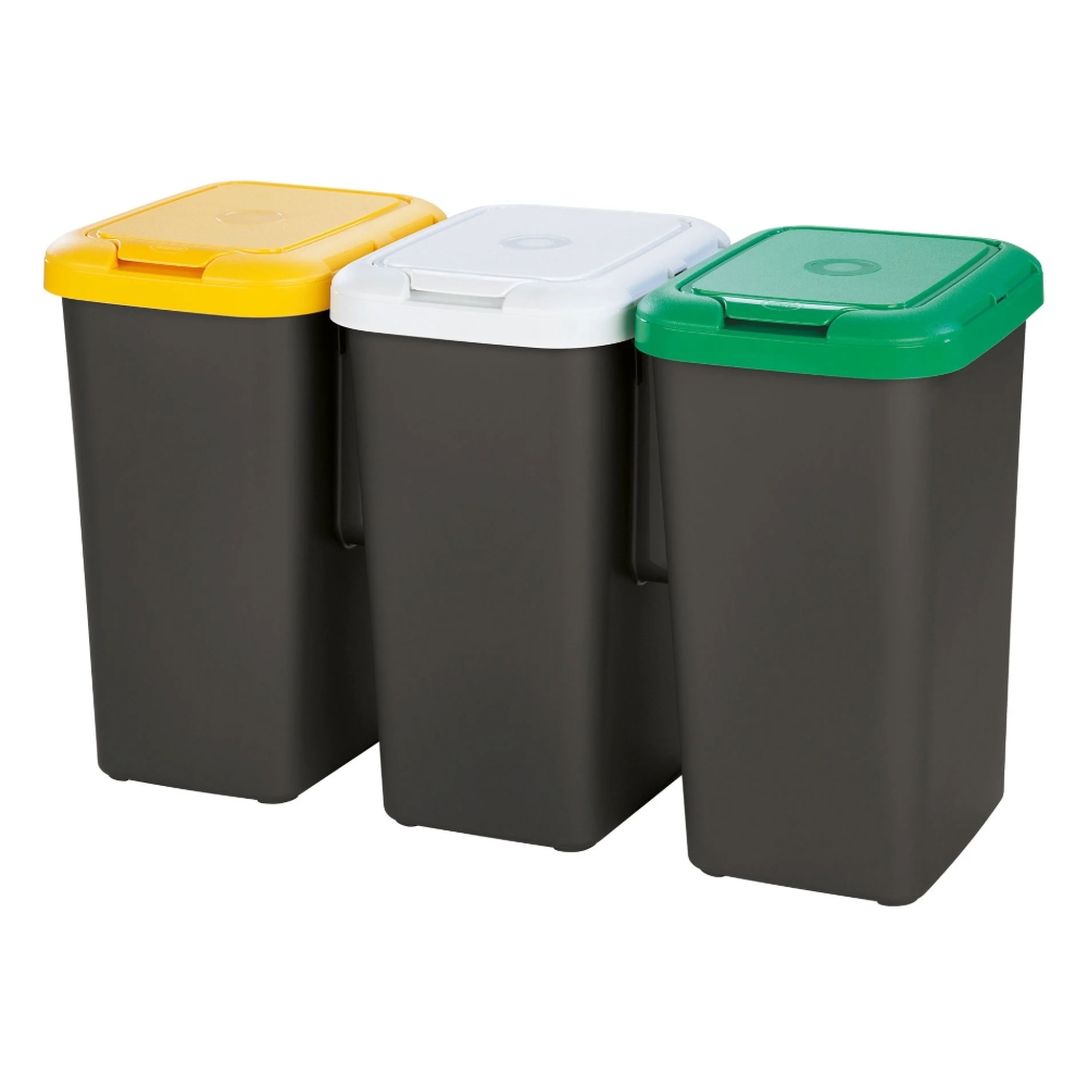 Il Tontarelli Trio è composto da tre contenitori distinti, ognuno dotato di anello interno ferma sacchetto e coperchio con chiusura a scatto, che garantiscono igiene, praticità e facilità d’uso. I diversi colori dei coperchi (generalmente giallo, verde e grigio) aiutano a identificare immediatamente il tipo di rifiuto da inserire – perfetto per separare plastica, carta, umido o indifferenziato in modo intuitivo e veloce.