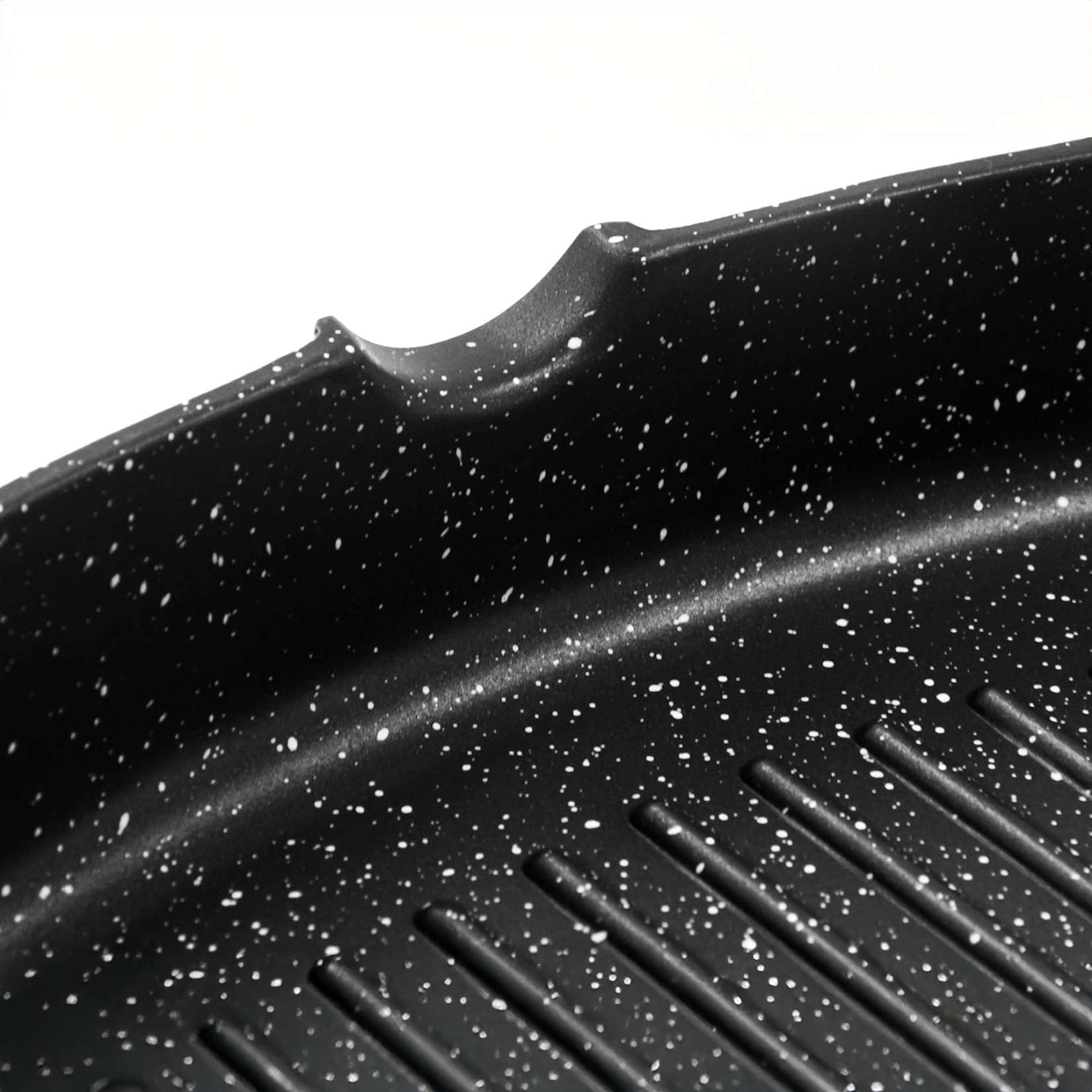 La superficie scanalata effetto grill permette di ottenere una cottura uniforme e naturale, mantenendo i liquidi all’interno degli alimenti e riproducendo la classica grigliatura a righe.